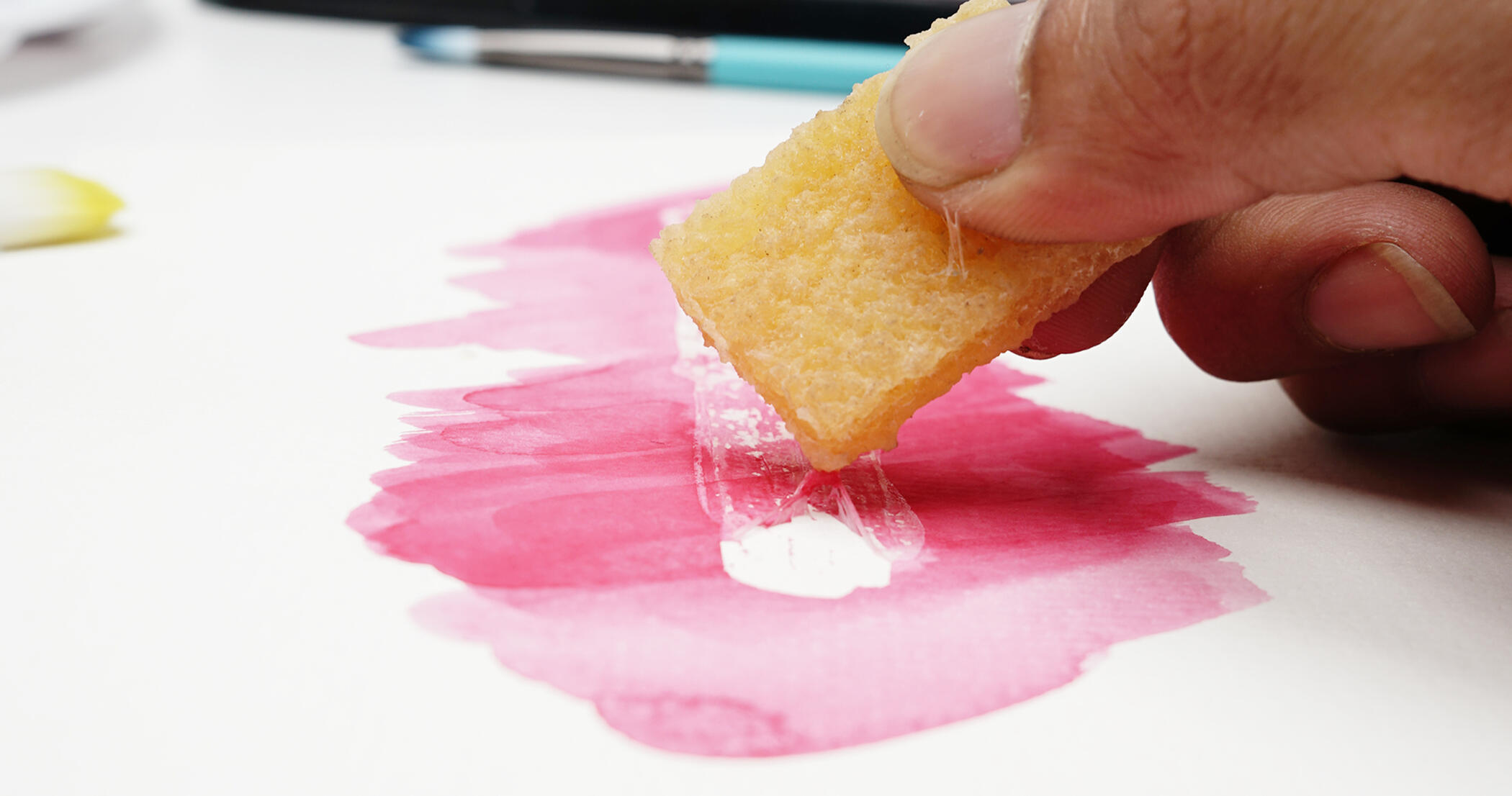 After the painting process is complete, it’s important to ensure that the paint is fully dry before you begin peeling off the MaskGoo. You can let it dry naturally, or if you’d like to speed things up, use a hair dryer as before. Make sure there are no damp areas left—removing MaskGoo while the paint is still wet may damage the paper’s texture or cause unwanted smudges.Once the paint is completely dry, it’s time to reveal the result by gently peeling the MaskGoo off the paper. You can use clean fingers or a rubber cement eraser, as shown in the image, to lift the rubbery masking layer. Gently rub over the masked areas, and you’ll see crisp white spaces appear underneath. This creates strong contrast and a professional finish, making it look as though the area was untouched by paint.This stage can be especially satisfying, as it reveals the final outcome of the careful steps you’ve taken. Be sure not to peel too forcefully to avoid damaging the paper’s surface—particularly if you’re using a softer type of paper