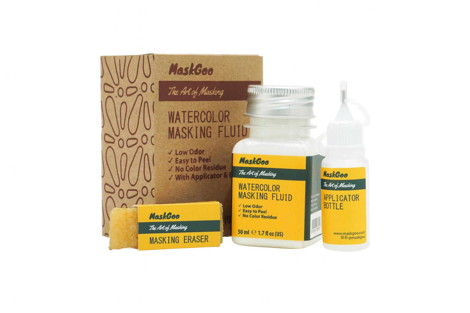 MaskGoo 50ml is a natural latex–based watercolor masking fluid that protects paper surfaces and preserves clean white highlights with precision.